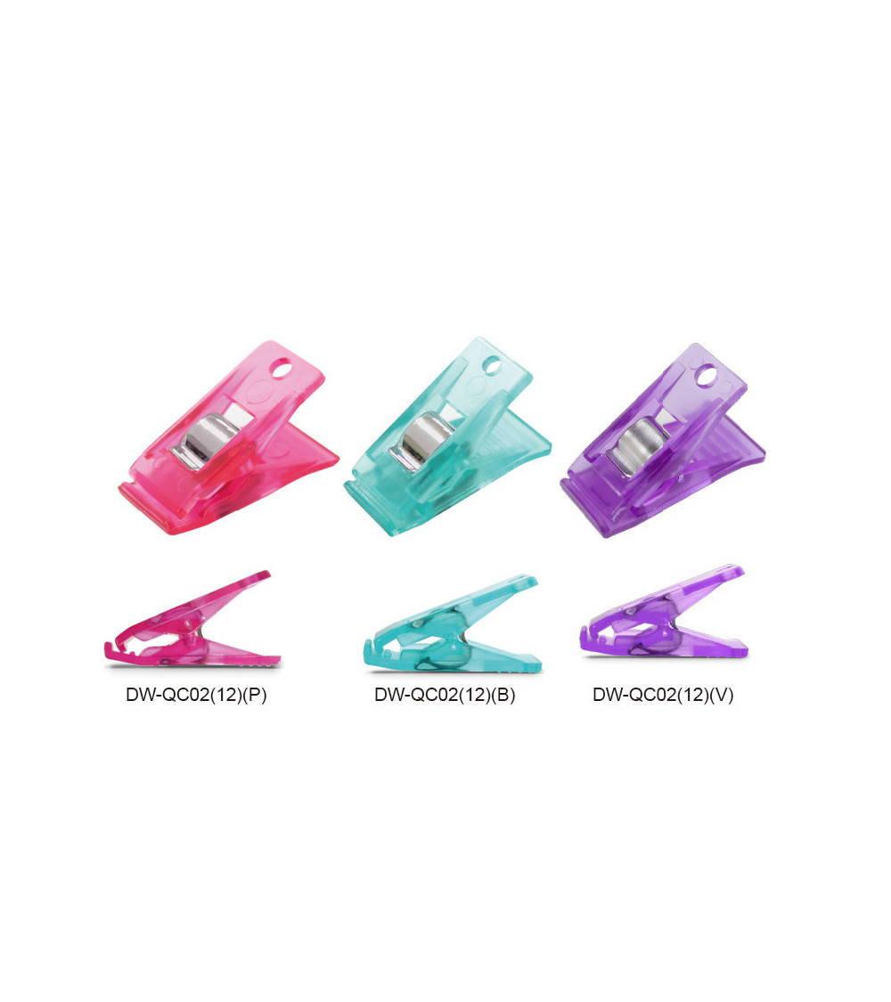 Set di 12 clips per il cucito creativo, ciascuna 13 x 27 mm. Le clips sono delle mini mollette, molto rigide. Sono un’utilissima alternativa agli spilli quando si devono cucire più strati (come per esempio tessuto esterno-cerniera-fodera), specialmente se i tessuti sono molto sostenuti o irrigiditi con stabilizzatori